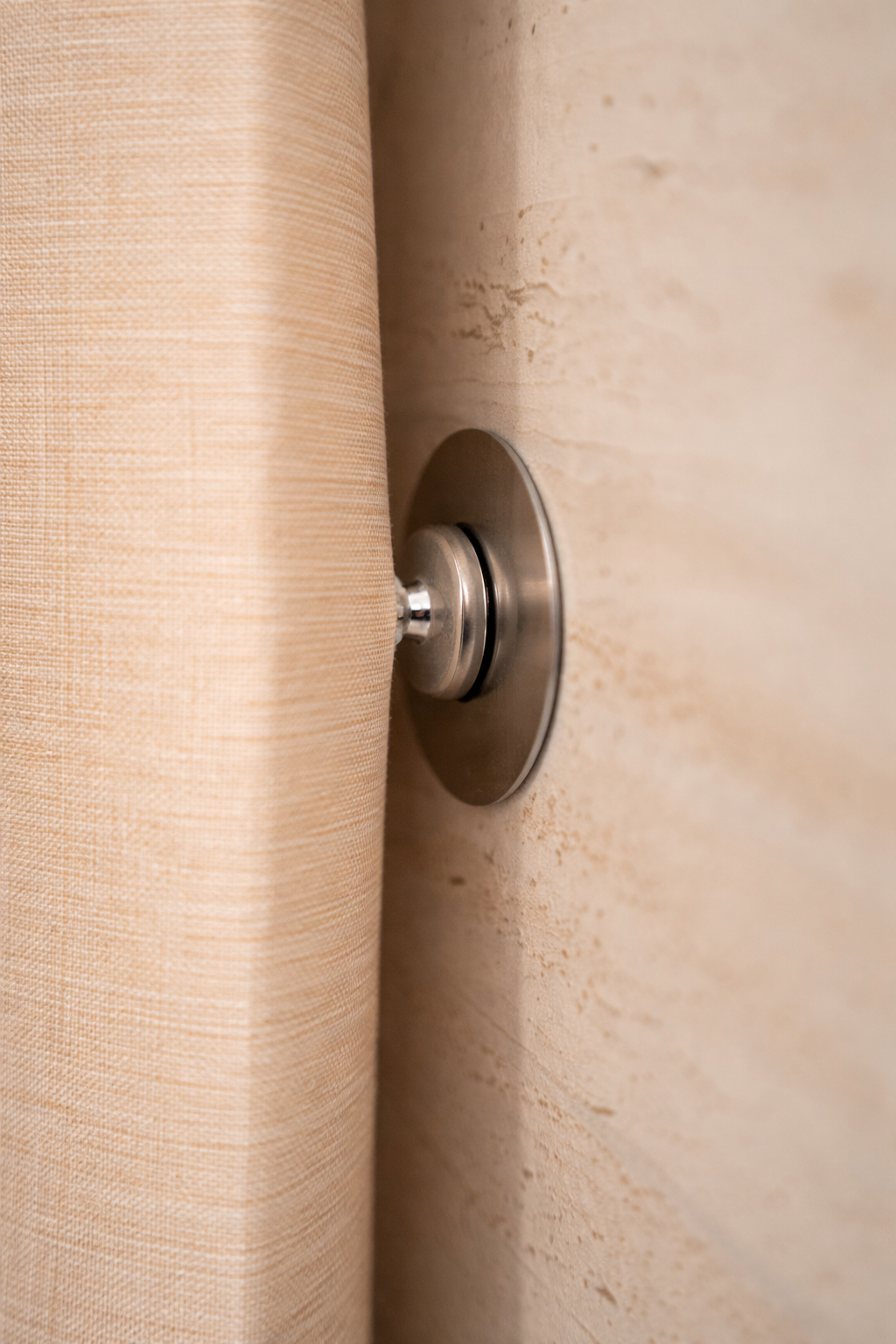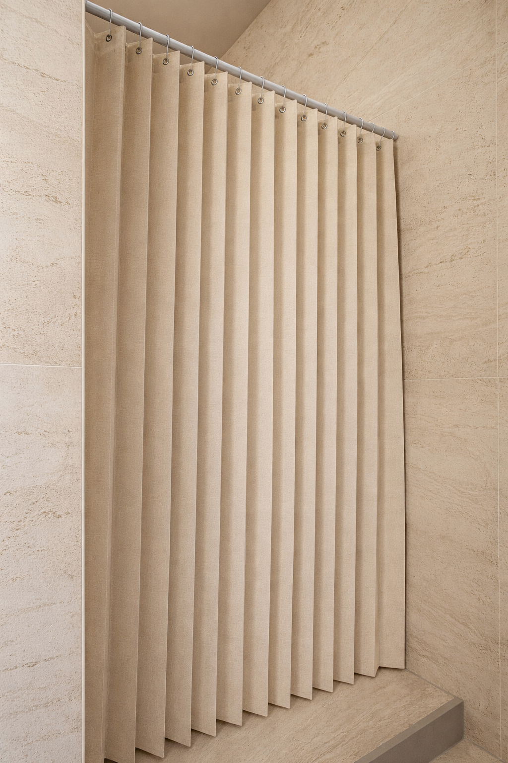 Linnen textuur – Gemaakt van hoogwaardig polyester met linnenlook, een stevig gemengd materiaal dat kreukvrij is en elegant recht valt. De natuurlijke uitstraling en strakke valling geven uw badkamer een gevoel van rust en luxe.