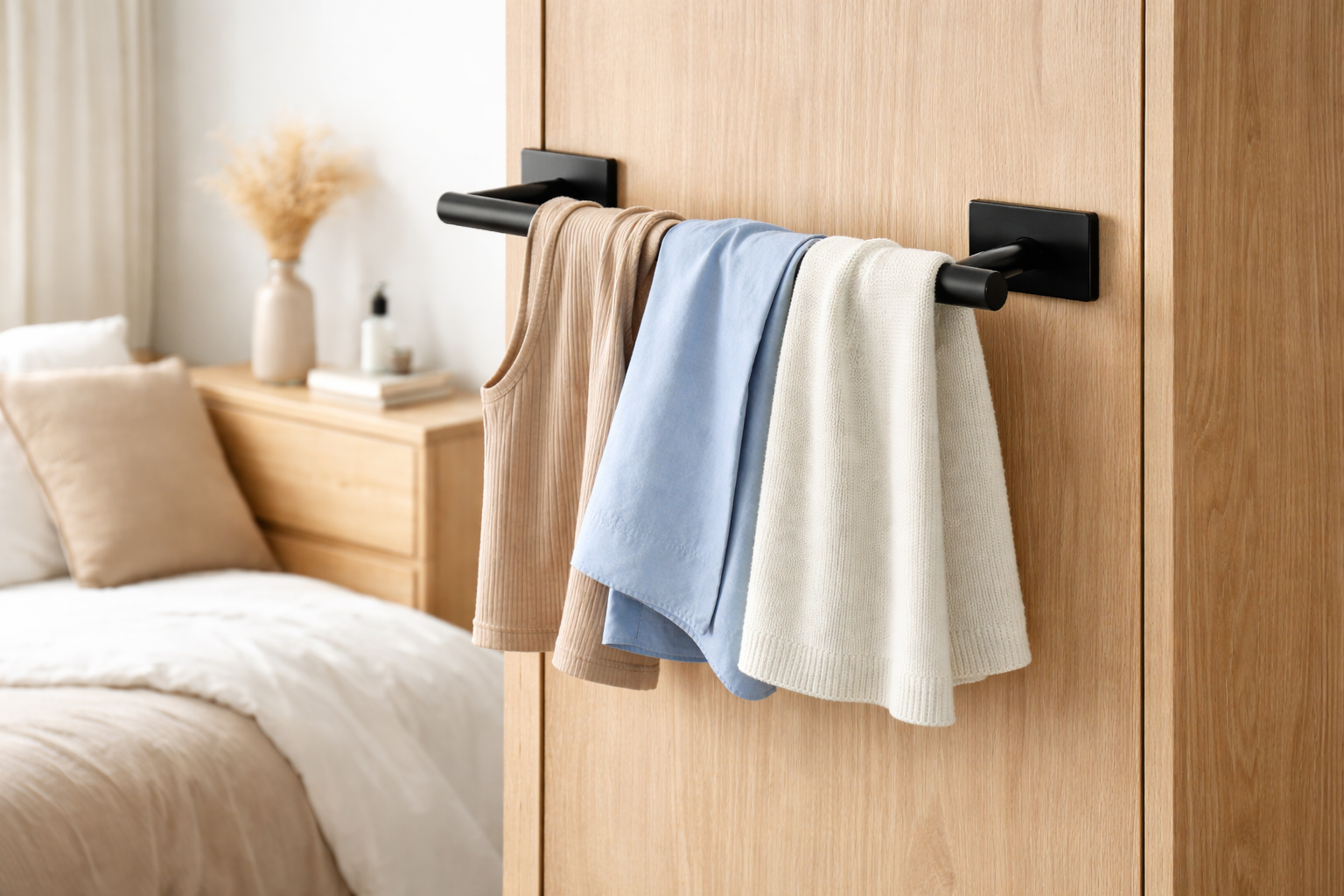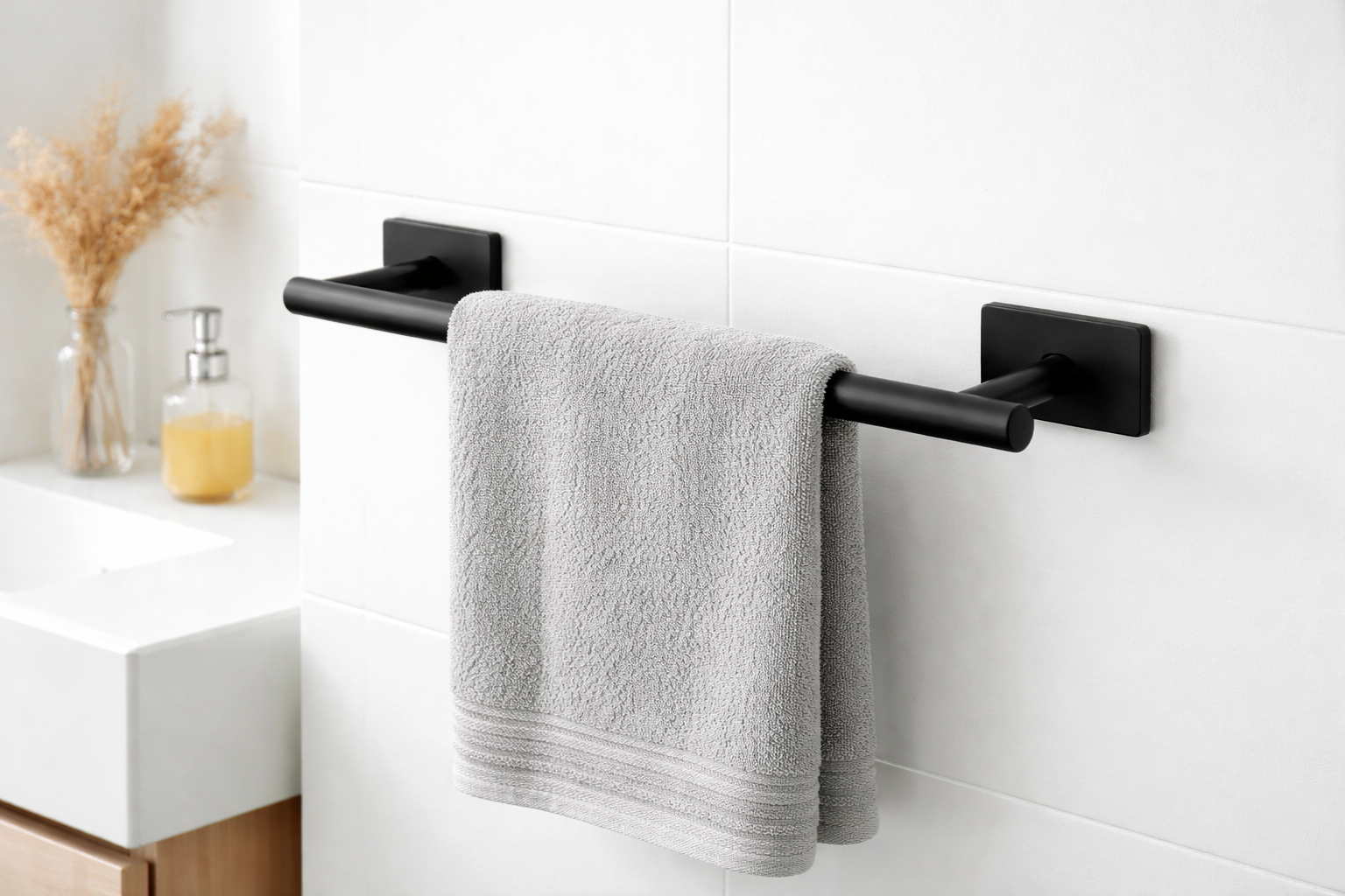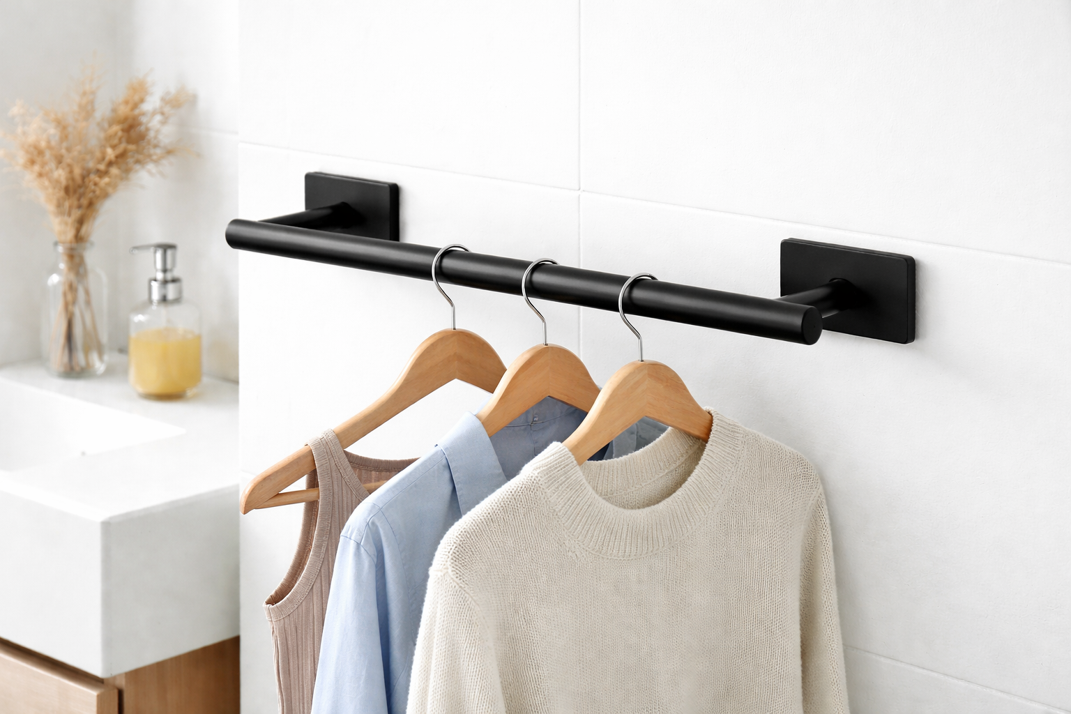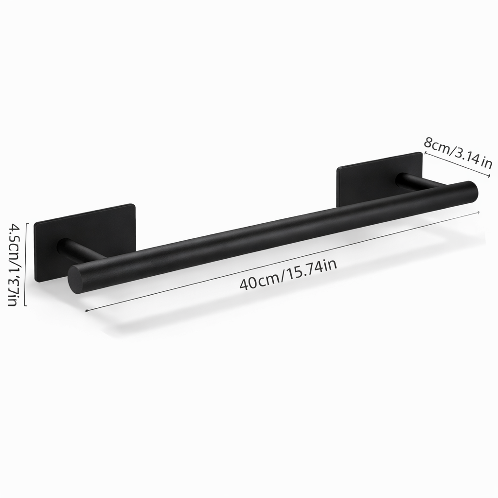 Dankzij de sterke zelfklevende montage bevestig je het rek eenvoudig op gladde oppervlakken zoals tegels, kasten of deuren. Perfect voor de badkamer, keuken, slaapkamer of kledingkast. Het strakke, matte zwarte design van roestvrij staal (RVS) geeft iedere ruimte een moderne en luxe uitstraling.